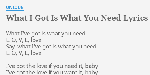 There are 60 lyrics related to Oh Baby You Got What I Need. There are 60 lyrics related to got What You Need. Ill be in the kitchen in your favorite position. All Im askin Is for a little respect When you come home just a little bit Hey baby just a little bit When you get home just a little bit Mister just a little bit I aint gonna do you wrong While youre gone Aint gonna do you wrong Cause I dont wanna All Im askin Is. I got what you want baby Baby lickin your lips I got what you want baby. Browse for I Got What You Want You Got What I Need song lyrics by entered search phrase. What you want Baby I got it What you need Do you know I got it. What you need lil baby. Tell me what you really really need lil baby Tell me what you Take you out and put you in double C lil babe.