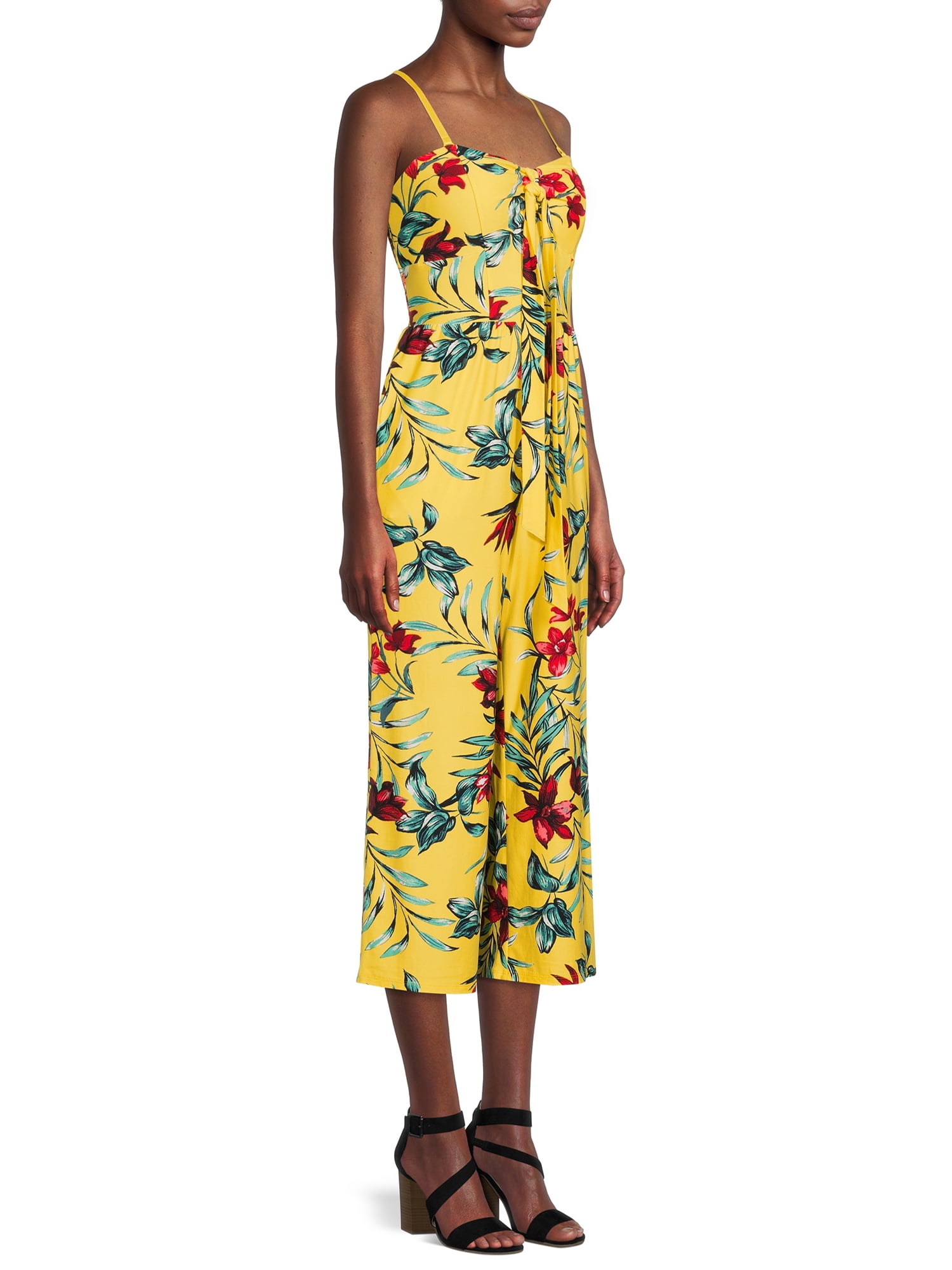 Griselle colored tie-front flared-leg jumpsuit by Socialite. This is one of those tie dresses that I saw and thought it would be SO cute on other people but not on me. Floral Tie-front styling creates a crop-top silhouette on this breezy romper in a vintage-chic floral outfit Deep V-neck - Short sleeves - Lined - 100 polyester - Machine wash tumble dry - Imported 44 bust 36 elastic waistband 60 length from shoulder to pant leg cuff.